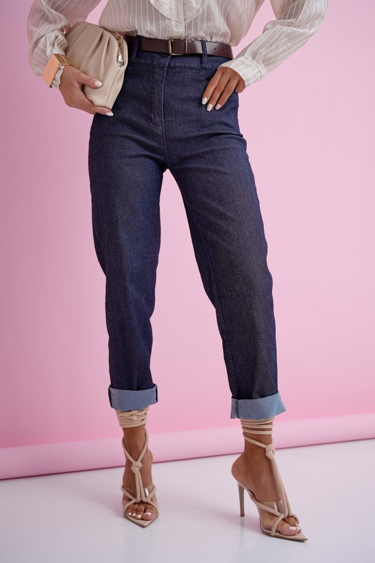 Stilingos aukšto liemens mom fit modelio kelnės. Tiesaus, šiek tiek laisvesnio silueto modelis su atlenkiamais klešnių galais, kišenėmis ir diržu. Plonesnis audinys, tamprus.