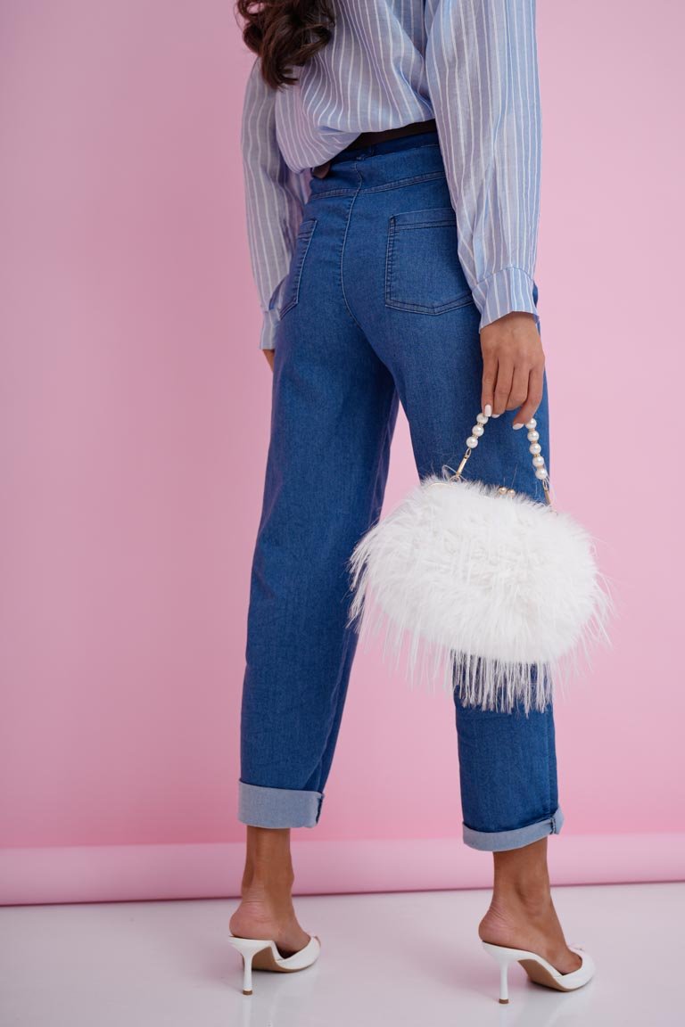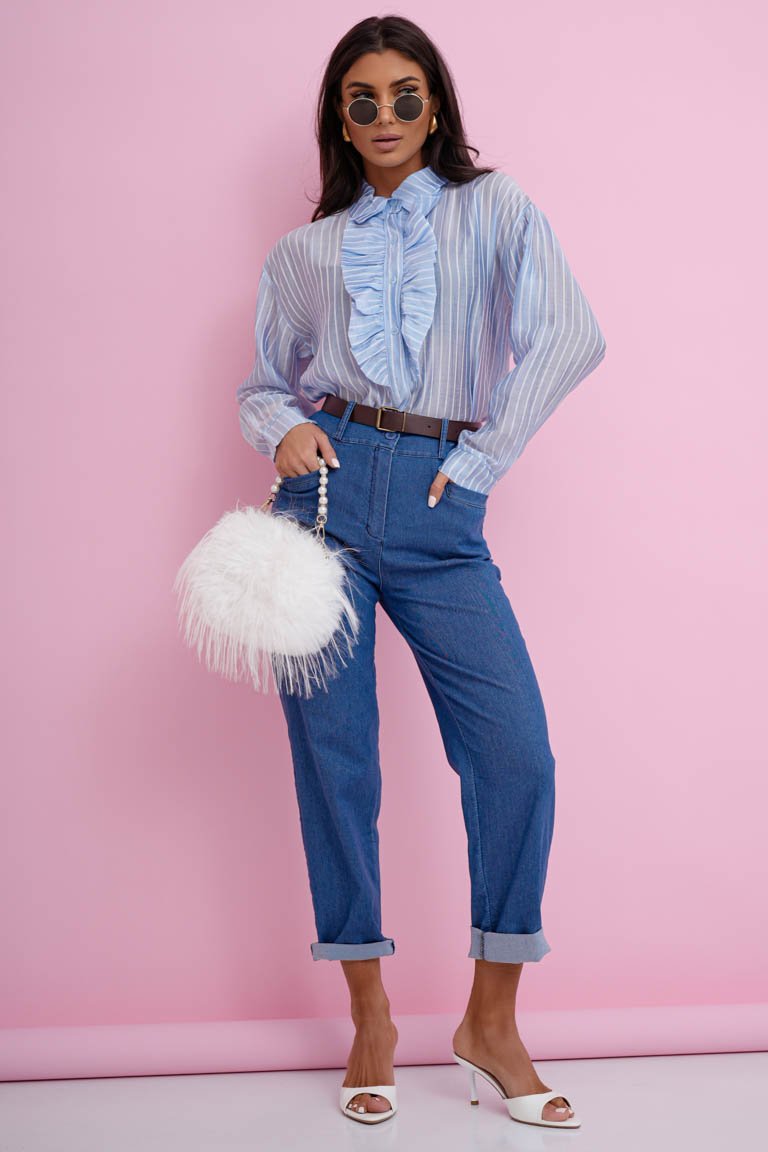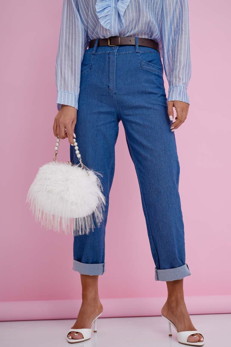 Stilingos aukšto liemens mom fit modelio kelnės. Tiesaus, šiek tiek laisvesnio silueto modelis su atlenkiamais klešnių galais, kišenėmis ir diržu. Plonesnis audinys, tamprus.