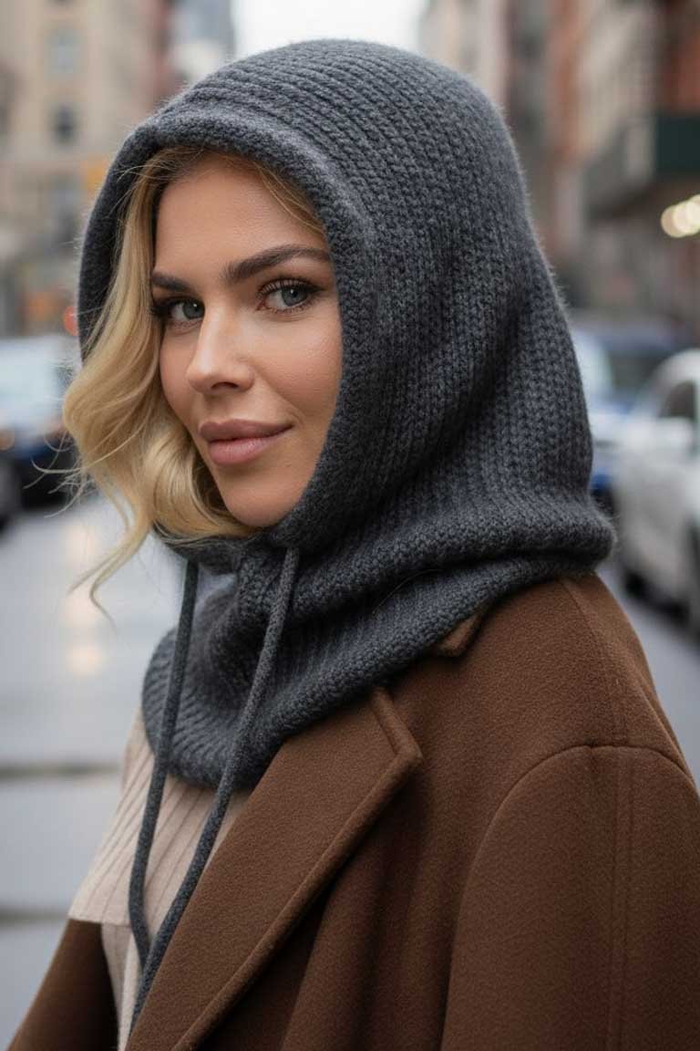 Megztas modernus ir elegantiškas galvos ir kaklo apdangalas. Turi reguliuojamus raištelius ties kaklo sritimi. Mezginys jaukus ir tamprus