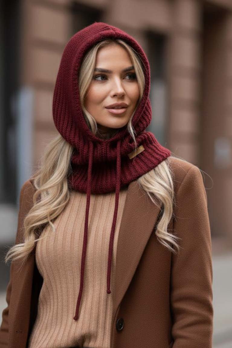 Megztas modernus ir elegantiškas galvos ir kaklo apdangalas. Turi reguliuojamus raištelius ties kaklo sritimi. Mezginys jaukus ir tamprus