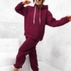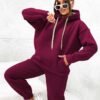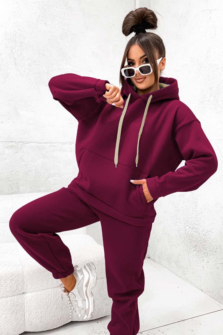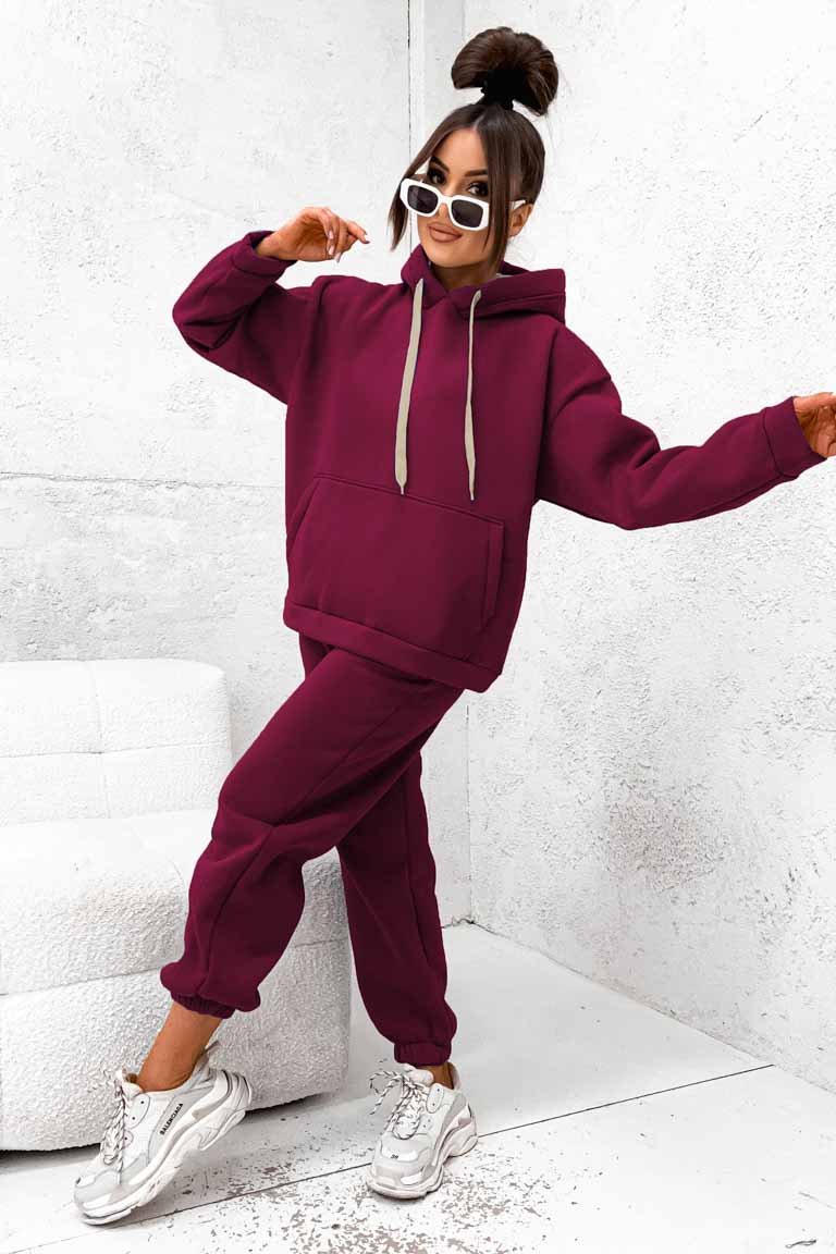 Stilingas šiltas sportinio stiliaus kostiumėlis. Džemperis platesnio modelio, su didele kišene ir kapišonu. Tiesaus modelio kelnės su kišenėmis. Liemuo bei kelnių galai su guma. Audinys storesnis, šiltas su pūkeliu, tamprus.