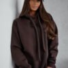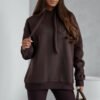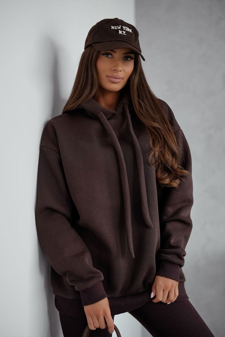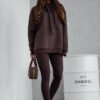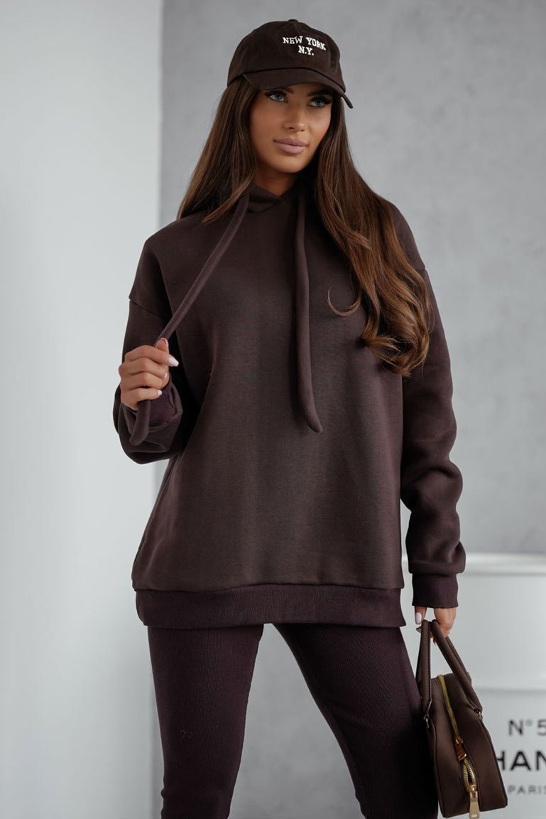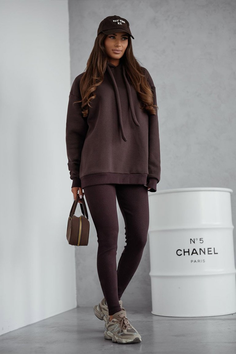 Stilingas šiltas sportinio stiliaus kostiumėlis. Džemperis platesnio bei ilgesnio modelio, su kapišonu rišamu stilinga virvute. Kelnės tamprės, liemuo guma. Džemperio audinys storesnis, šiltas su pūkeliu, tamprus. Kelnių audinys vidutinio storumo, tamprus