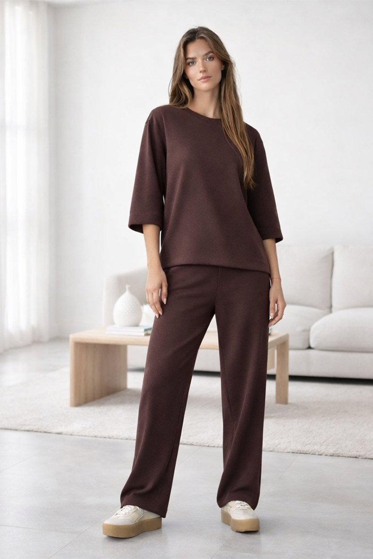 Stilingas laisvalaikio kostiumėlis. Palaidinė 3/4 rankovėmis, plataus modelio. Plačios tiesaus modelio kelnės su kišenėmis. Juosmuo su guma. Audinys plonesnis, jaukus ir tamprus.