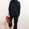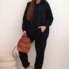 Šiltas laisvalaikio kostiumėlis. Džemperis laisvesnio ir ilgo modelio su kišene bei kapišonu. Siaurėjančios kelnės su kišenėmis, liemuo guma. Audinys storesnis, su pūkeliu, tamprus.