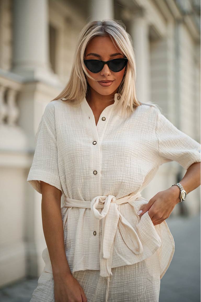 Stilingas laisvalaikio kostiumėlis vasarai. Marškiniai laisvesnio modelio, galima dėvėti su dirželiu. Laisvesni šortai su kišenėmis. Juosmuo su guma bei rišasi virvute. Audinys plonesnis, mažai tamprus.