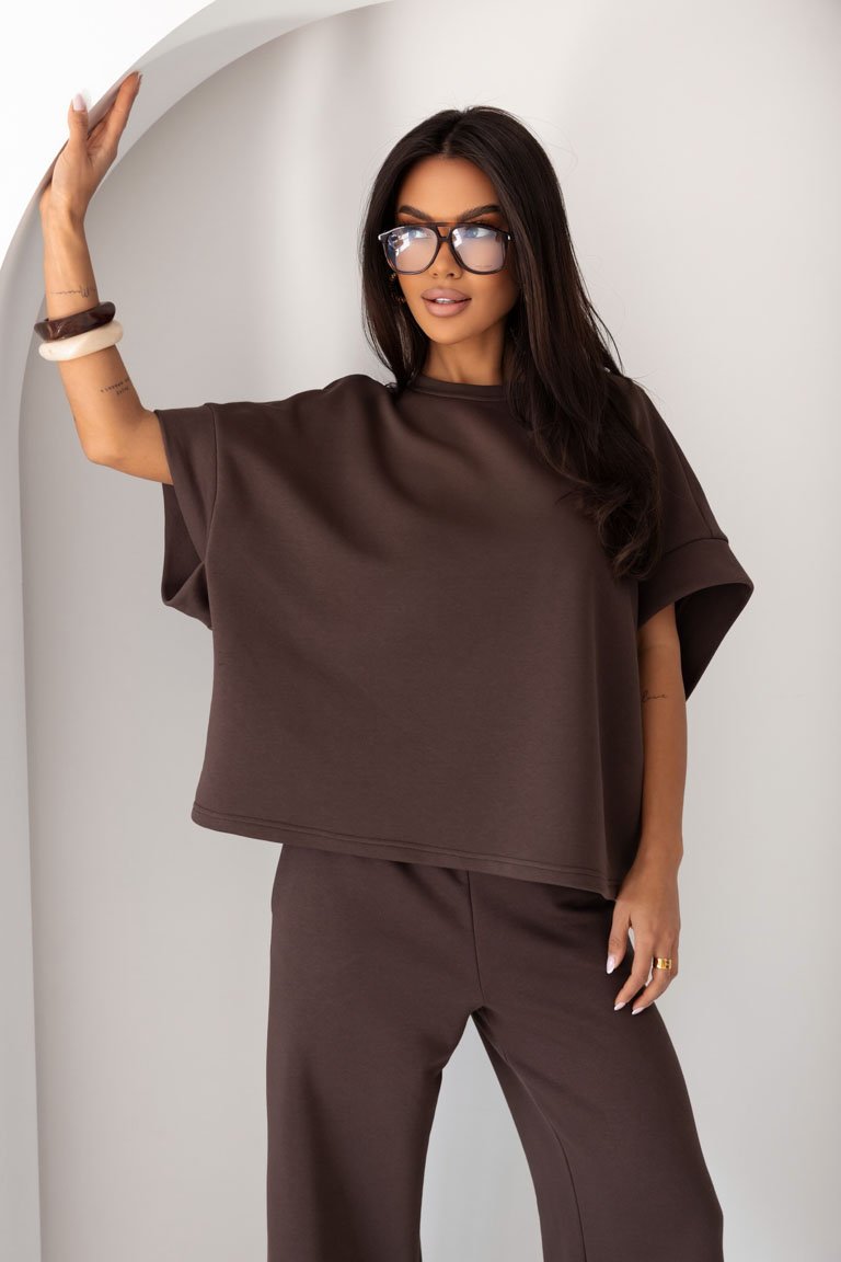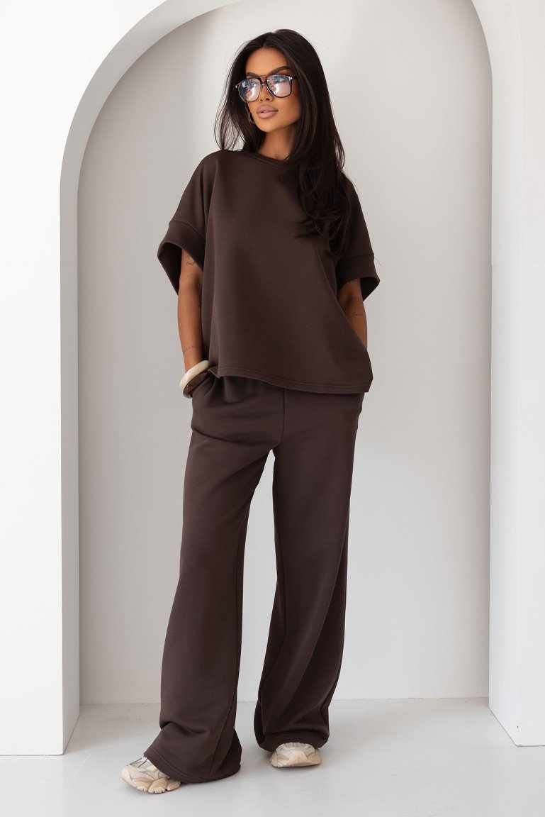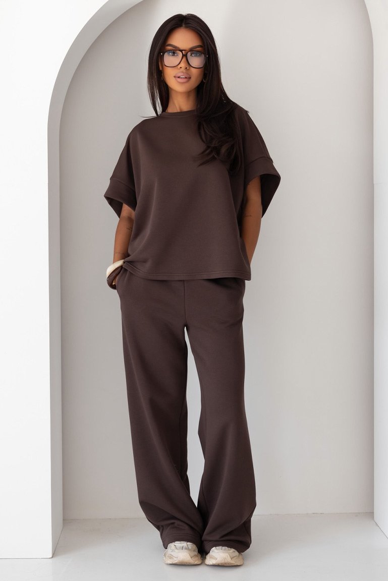Stilingas laisvalaikio kostiumėlis su itin laisvo silueto palaidine ir plačiomis kelnėmis su kišenėmis. Juosmuo guma. Vidutinio storumo, medvilninis audinys tamprus ir komfortiškas