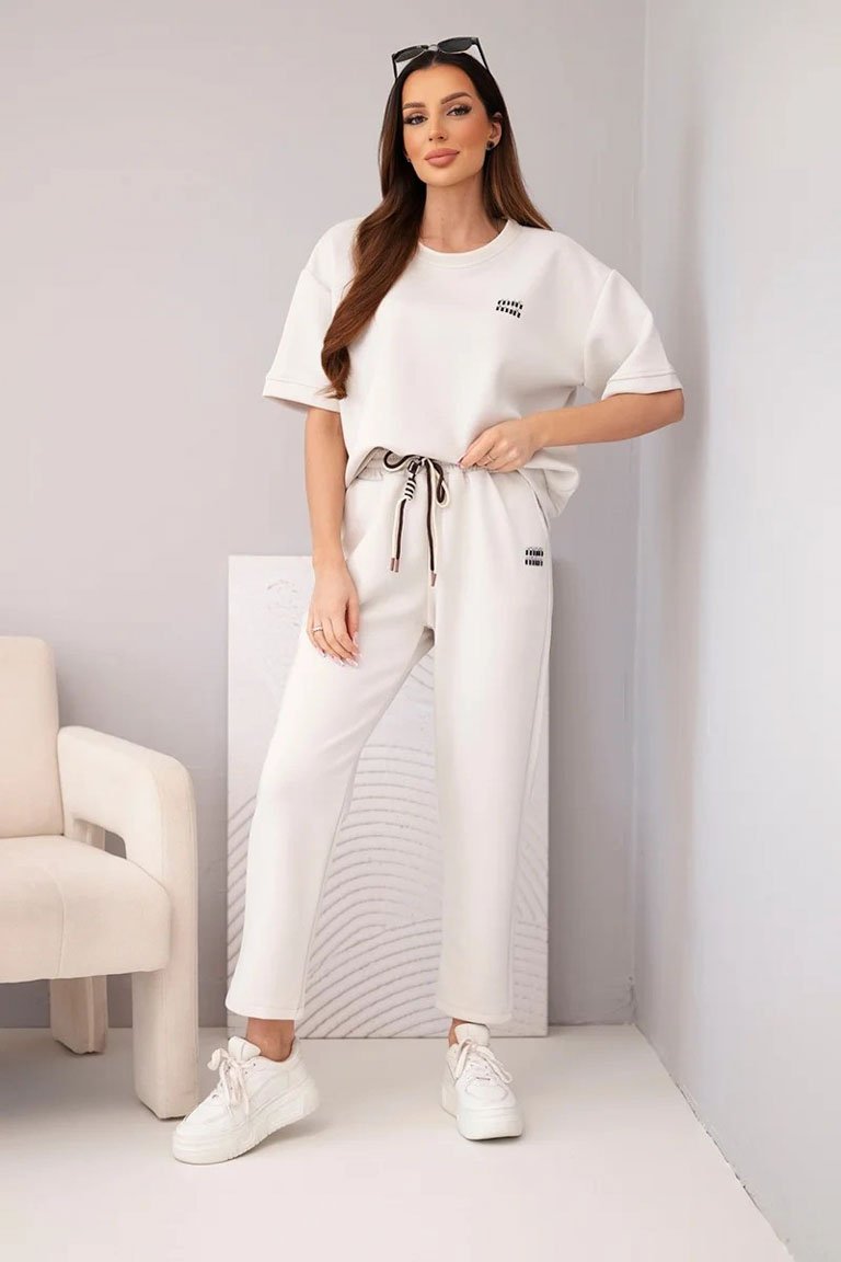 Stilingas laisvalaikio kostiumėlis trumpomis rankovėmis. Palaidinė laisvesnio modelio. Siaurėjančios kelnės, su kišenėmis, liemuo guma bei rišasi virvute. Audinys vidutinio storumo, tamprus.