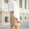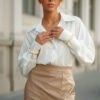 Puošnūs satininiai klasikinio stiliaus marškiniai ilgomis rankovėmis. Su stilingais ilgesniais rankogaliais. Audinys lengvai krentantis, vidutinio storumo, mažai tamprus.