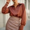 Puošnūs satininiai klasikinio stiliaus marškiniai ilgomis rankovėmis. Su stilingais ilgesniais rankogaliais. Audinys lengvai krentantis, vidutinio storumo, mažai tamprus.