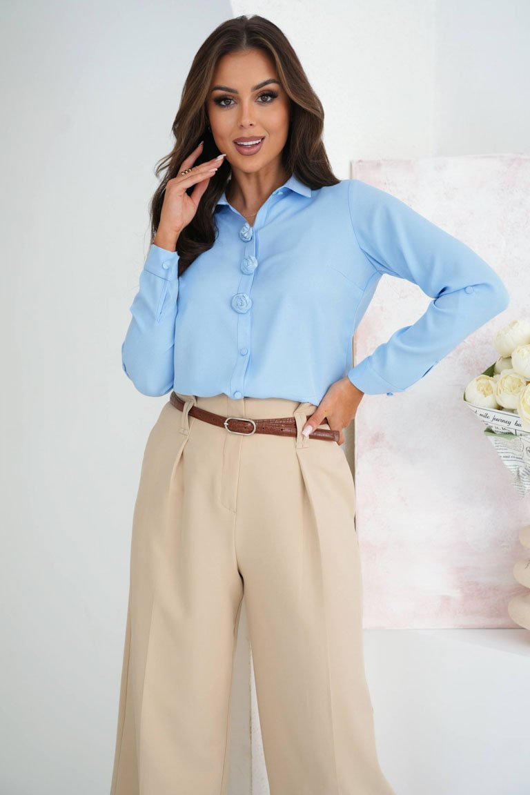 Elegantiški klasikinio stiliaus marškiniai ilgomis rankovėmis. rankovės gali trumpintis iki 3/4. Rožytės (sagės) nusiima. Audinys plonesnis, lengvai krentantis, mažai tamprus ir neglamžus.