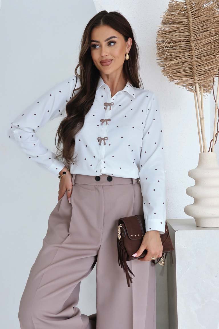 Elegantiški klasikinio stiliaus marškiniai. Kaspinėliai (sagės) nusiima. Audinys plonesnis, lengvai krentantis, mažai tamprus ir neglamžus