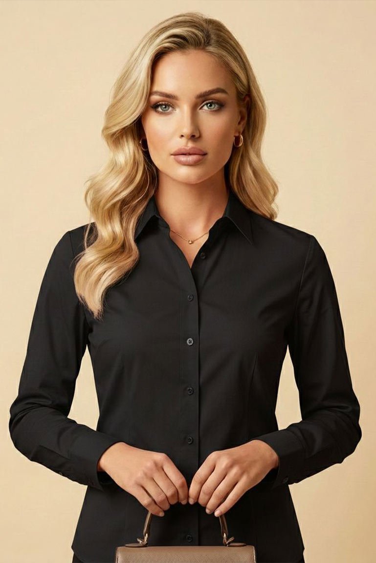 Elegantiški klasikinio stiliaus liemenuoti marškiniai ilgomis rankovėmis. Audinys plonesnis, tamprus