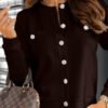 Stilingas jaukus ir minkštas klasikinio stiliaus, švarkelio tipo megztinis ilgomis rankovėmis, segamas sagomis. Audinys vidutinio storumo, jaukus ir tamprus.