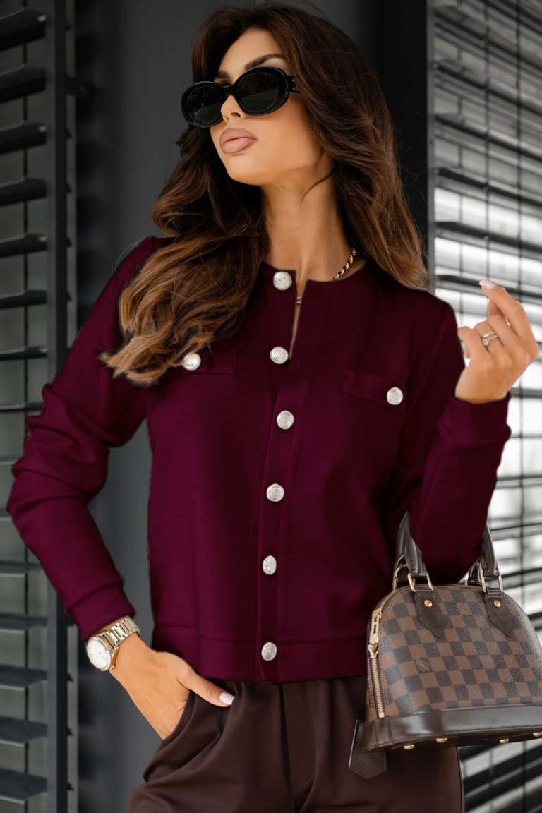 Stilingas jaukus ir minkštas klasikinio stiliaus, švarkelio tipo megztinis ilgomis rankovėmis, segamas sagomis. Audinys vidutinio storumo, jaukus ir tamprus.
