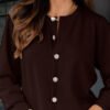 Stilingas jaukus ir minkštas klasikinio stiliaus, švarkelio tipo megztinis ilgomis rankovėmis, segamas sagomis. Audinys vidutinio storumo, jaukus ir tamprus.