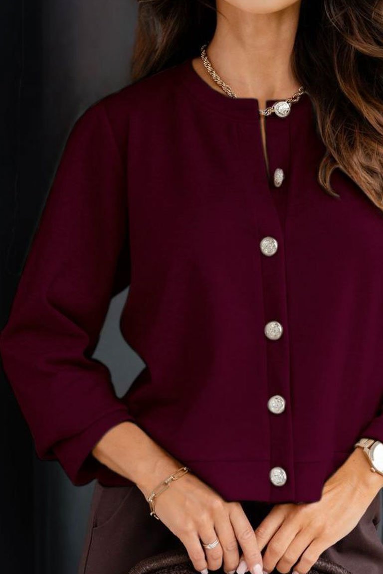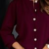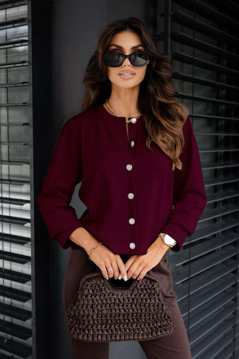 Stilingas jaukus ir minkštas klasikinio stiliaus, švarkelio tipo megztinis ilgomis rankovėmis, segamas sagomis. Audinys vidutinio storumo, jaukus ir tamprus.