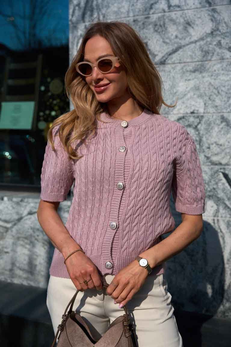 Stilingas jaukus ir minkštas laisvalaikio megztinis ilgomis rankovėmis, segamas sagomis. Mezginys vidutinio storumo, jaukus ir tamprus.