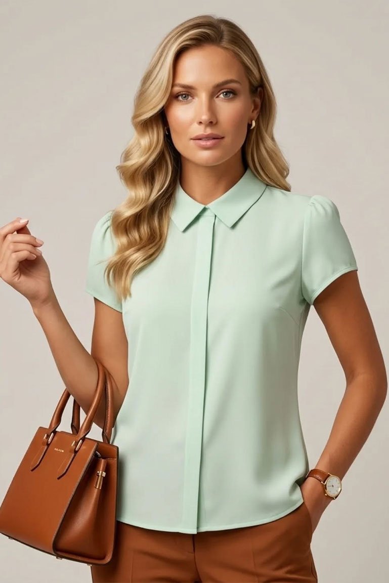 Elegantiška klasikinio stiliaus palaidinė trumpomis rankovėmis. Audinys plonesnis, lengvai krentantis, mažai tamprus ir neglamžus