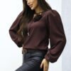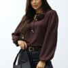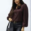 Klasikinė elegantiška puošni palaidinė parauktomis ilgomis rankovėmis. Sagė gėlė išsisega. Audinys lengvai krentantis, mažai tamprus.