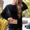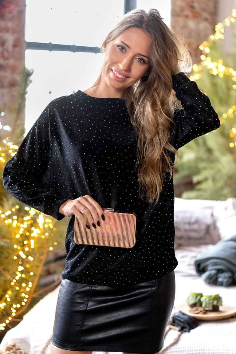 Stilinga puošni palaidinė ilgomis kimono rankovėmis, nuleista pečių linija. Audinys dekoruotas blizgiomis detalėmis, vidutinio storumo, mažai tamprus.