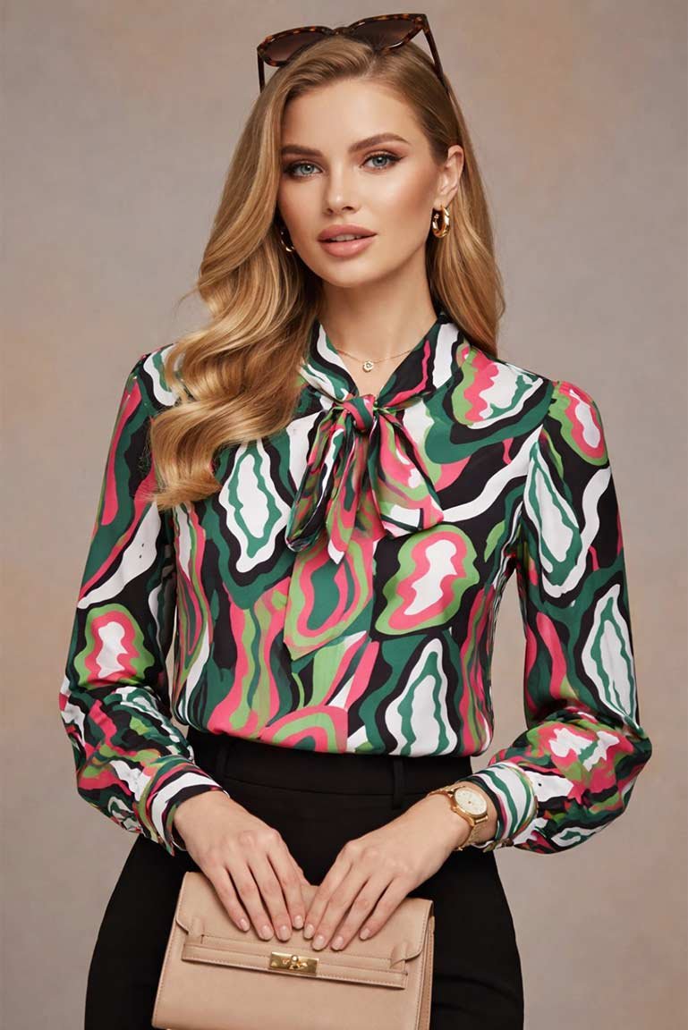 Klasikinė puošni palaidinė ilgomis šiek tiek pūstomis rankovėmis. Apykaklė rišasi juostele. Audinys vidutinio storumo, netamprus.
