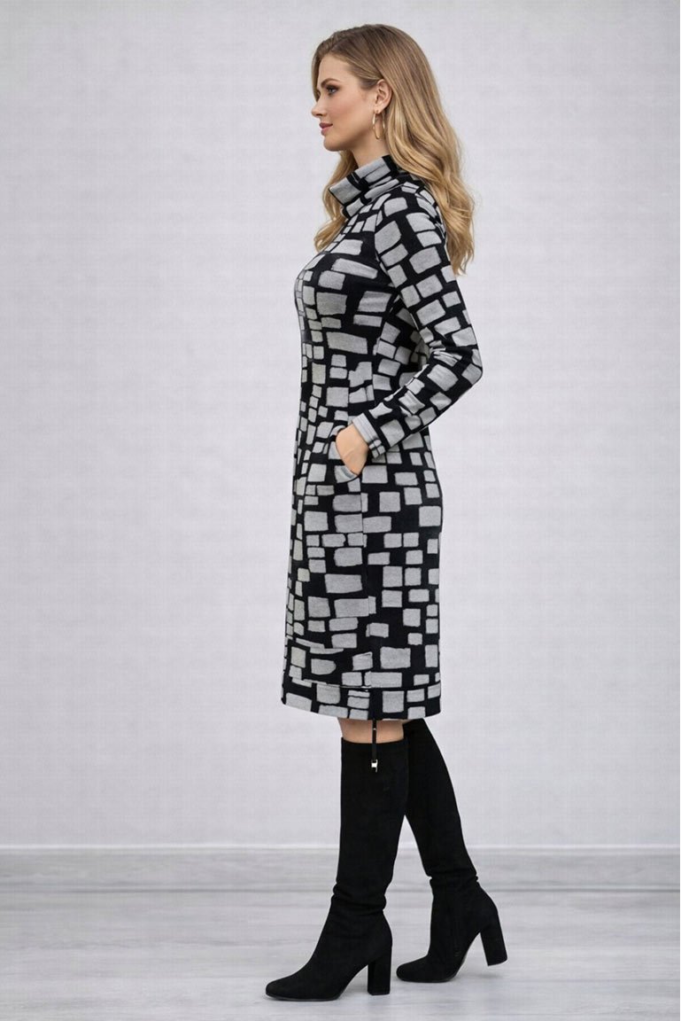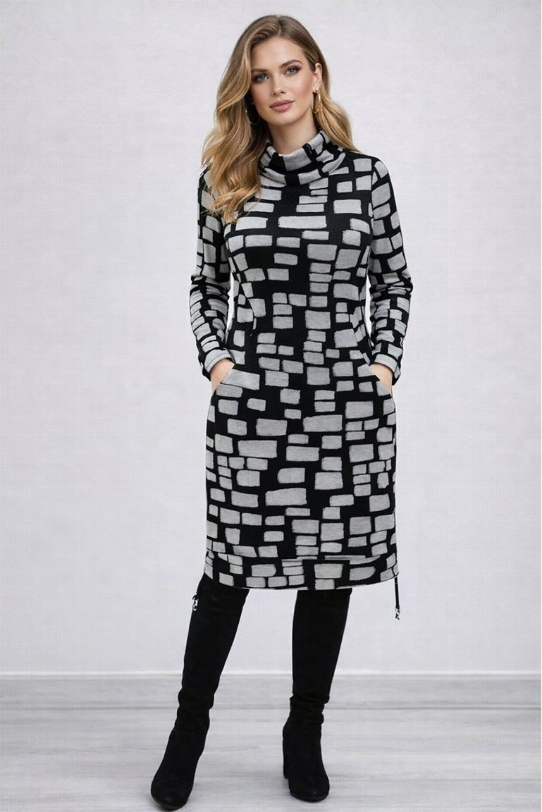 Elegantiški klasikinio stiliaus suknelė su kišenėmis. Lengvai paliemenuota, aukštesne apykakle. Audinys vidutinio storumo, jaukus ir tamprus