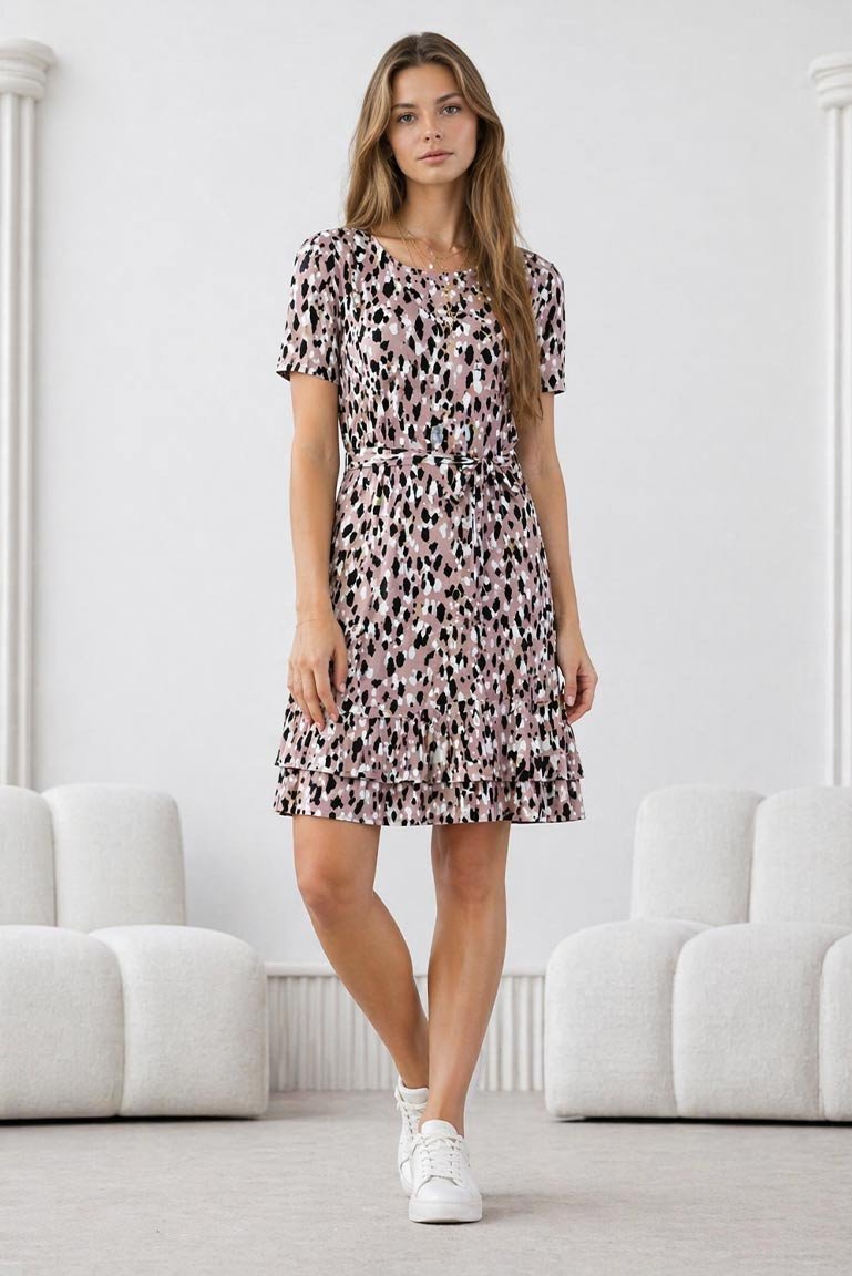 Stilinga laisvalaikio suknelė trumpomis rankovėmis. Modelis platėjantis, ilgėjančia nugara, su bangele apačioje, su kišenėmis. Galime dėvėti su dirželiu ir be jo. Audinys lengvas, plonas, mažai tamprus.