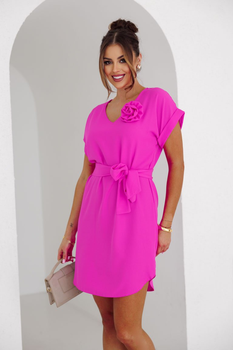 Elegantiška vasariška suknelė tiesaus silueto, rišasi dirželiu, subtiliai pabrėžiančiu liemenį. Dekoratyvinė rožės sagė nusegama, o lengvas, plonesnis audinys mažai tamprus ir maloniai krentantis