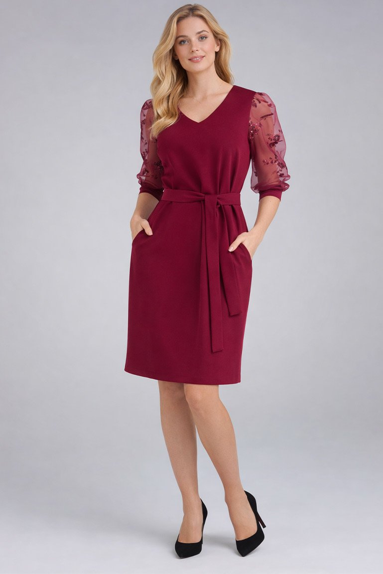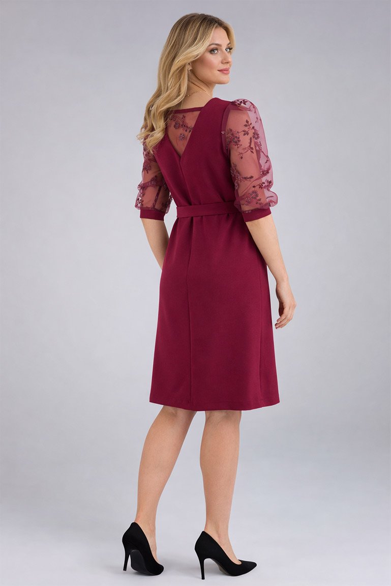 Puošni tiesaus modelio suknelė. Rankoves ir nugara dekoruota puošniu tiuliu. Audinys plonesnis, mažai tamprus.