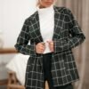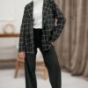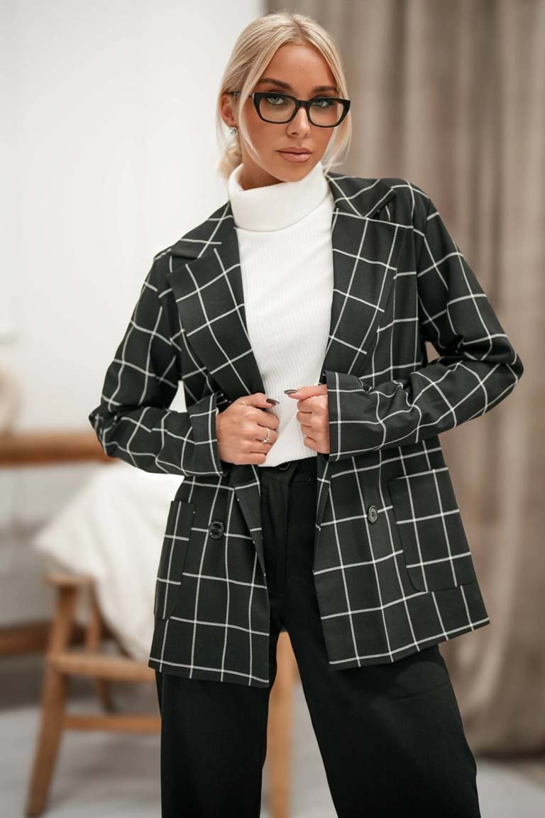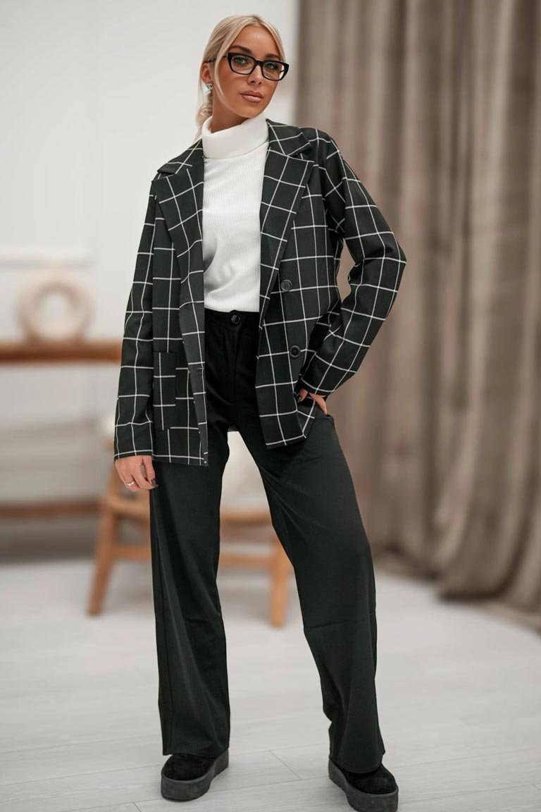 Stilingas laisvalaikio švarkas ilgomis rankovėmis. Ilgesnio modelio, su pamušalu ir segamas saga. Audinys vidutinio storumo, mažai tamprus