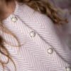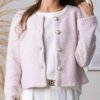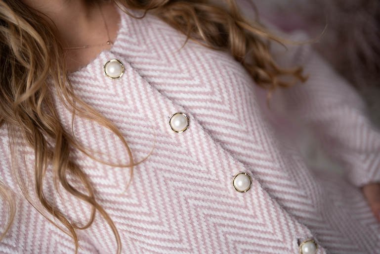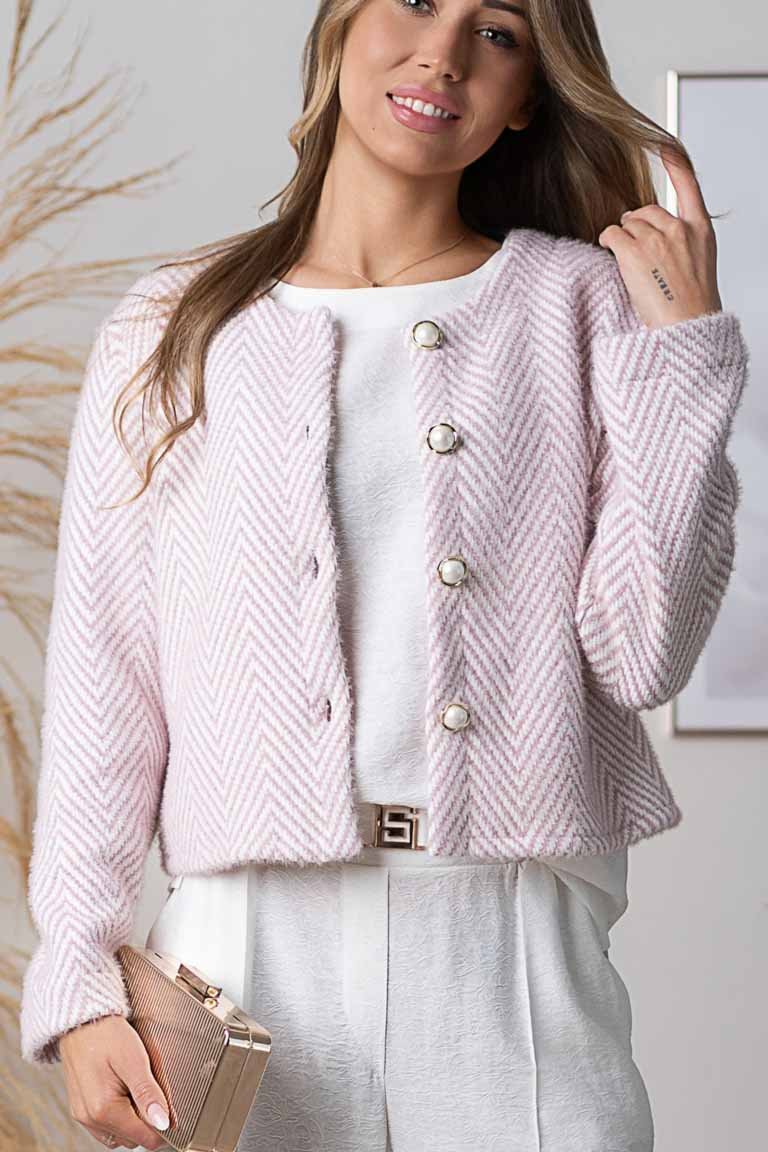 Stilingas elegantiškas klasikinio stiliaus švarkelis ilgomis rankovėmis, segamas sagomis. Audinys storesnis, tampru.