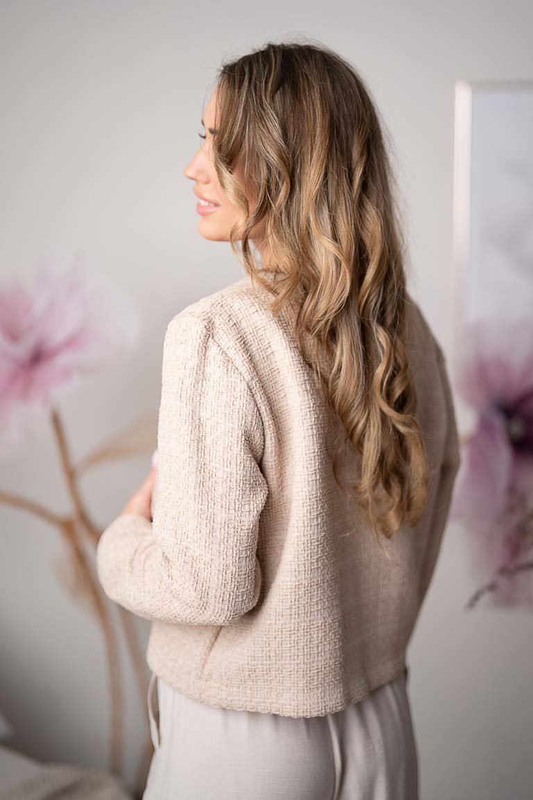 Stilingas elegantiškas klasikinio stiliaus švarkelis ilgomis rankovėmis, segamas sagomis. Audinys vidutinio storumo, mažai tampru.